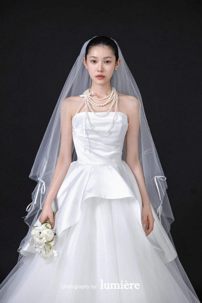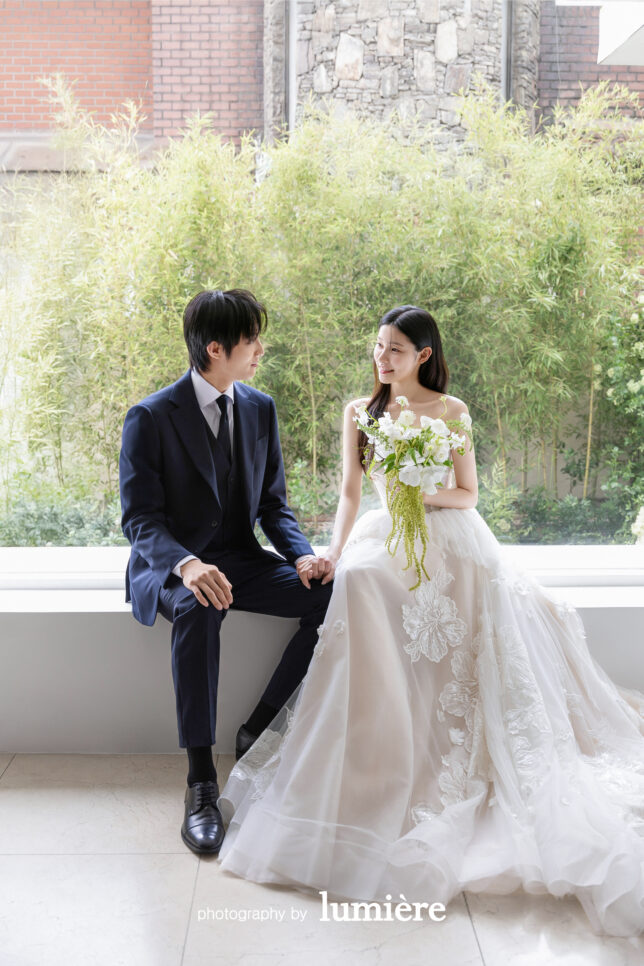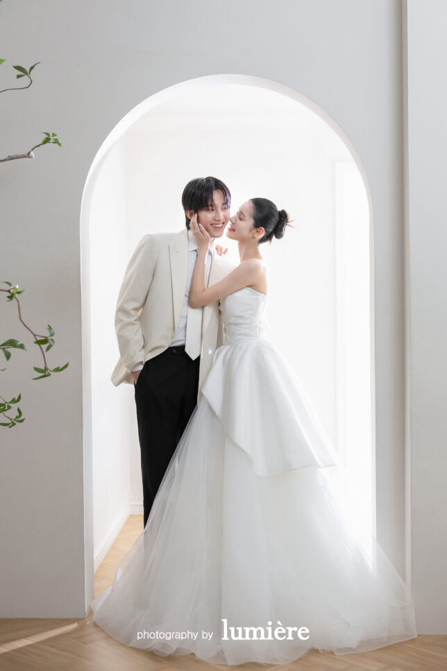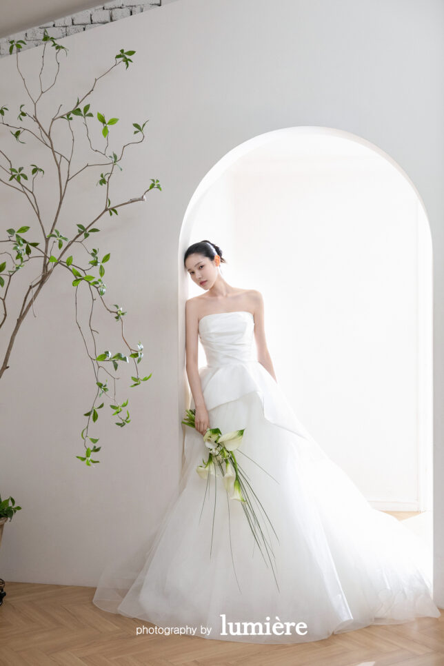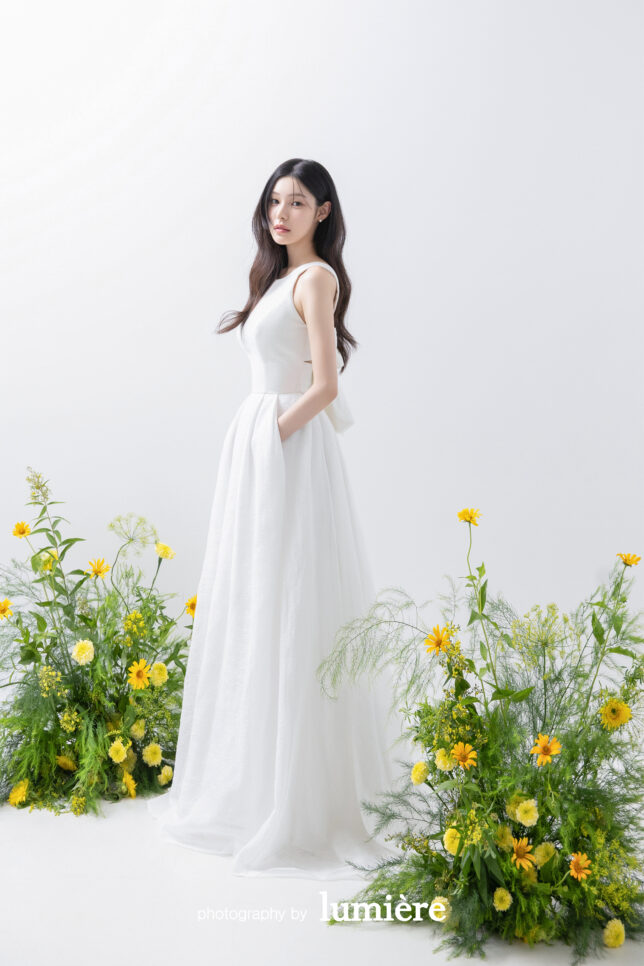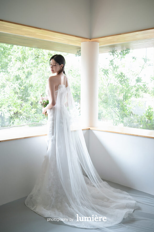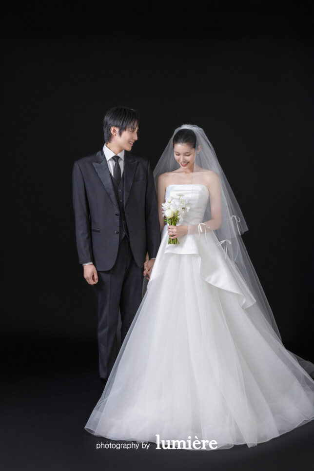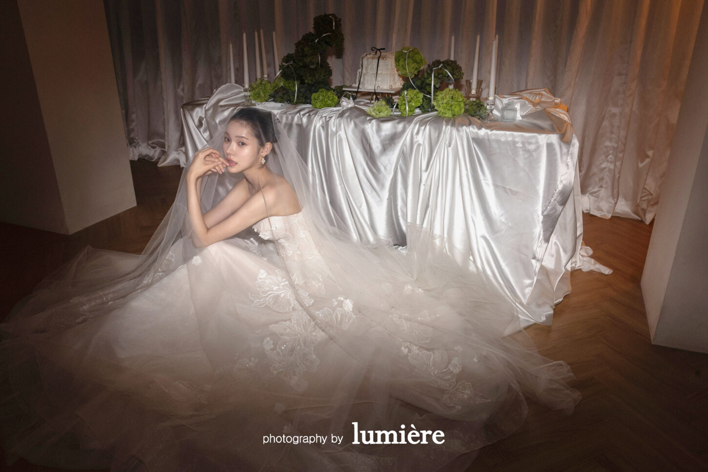 ドレスサロンのドレスを3つ着用でき、シンプルながらも人物中心のきれいな写真が撮れます。