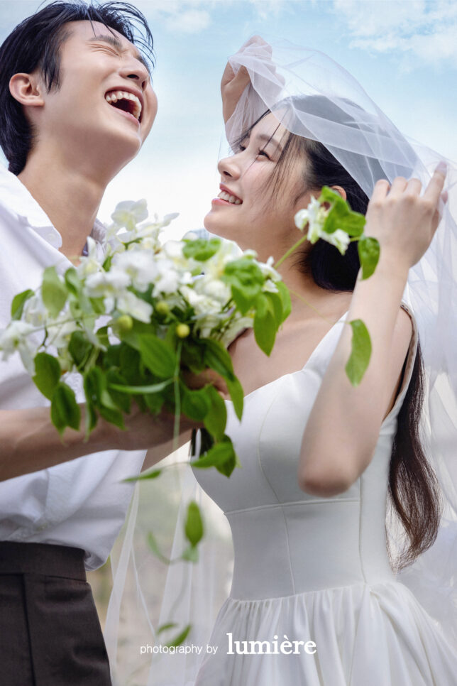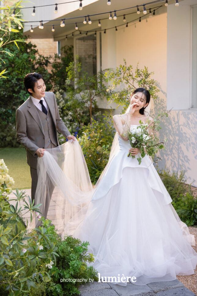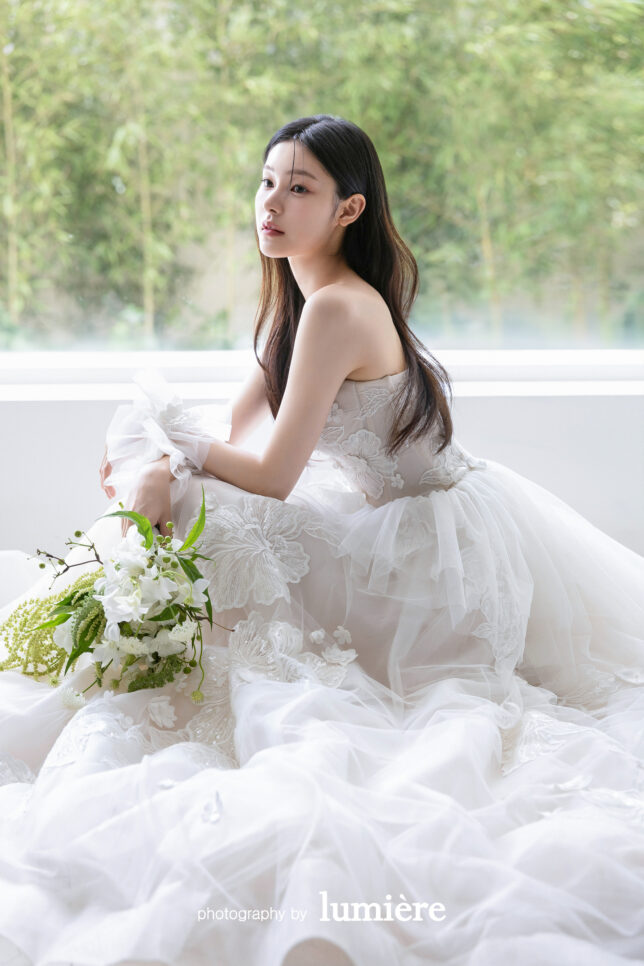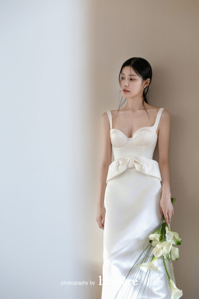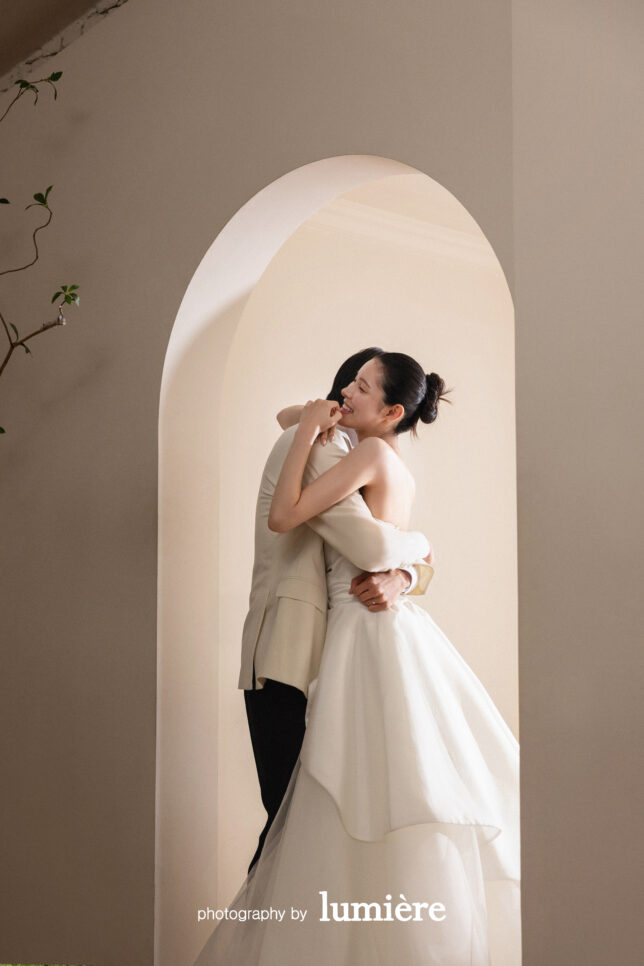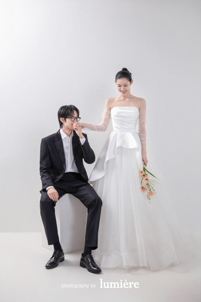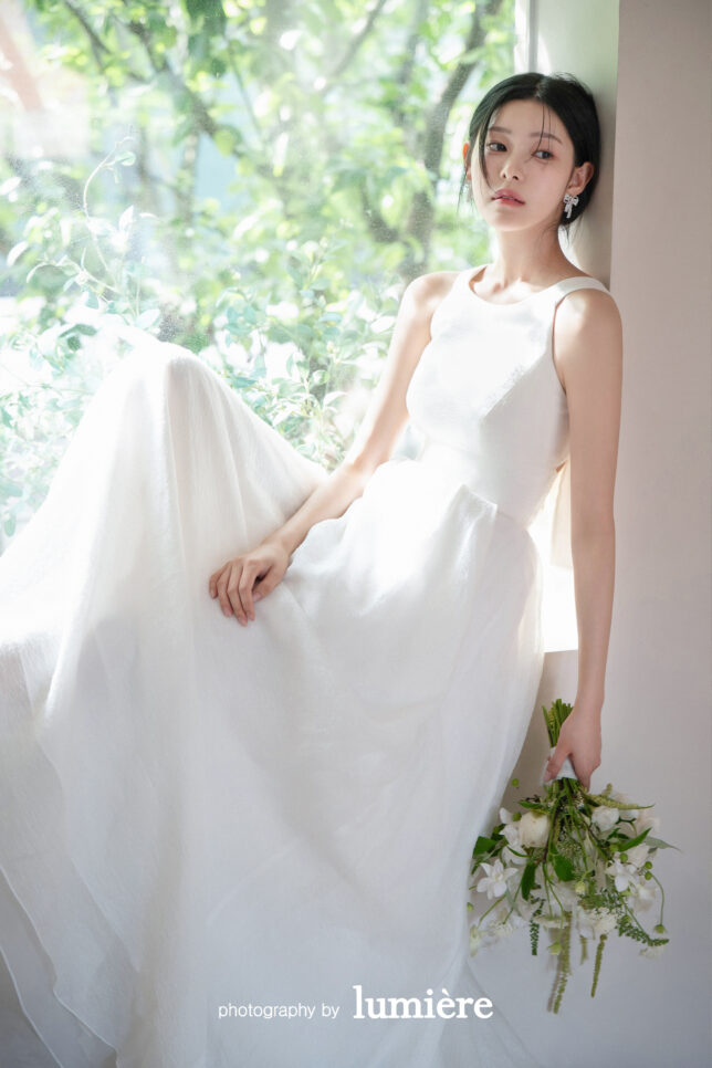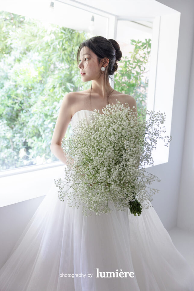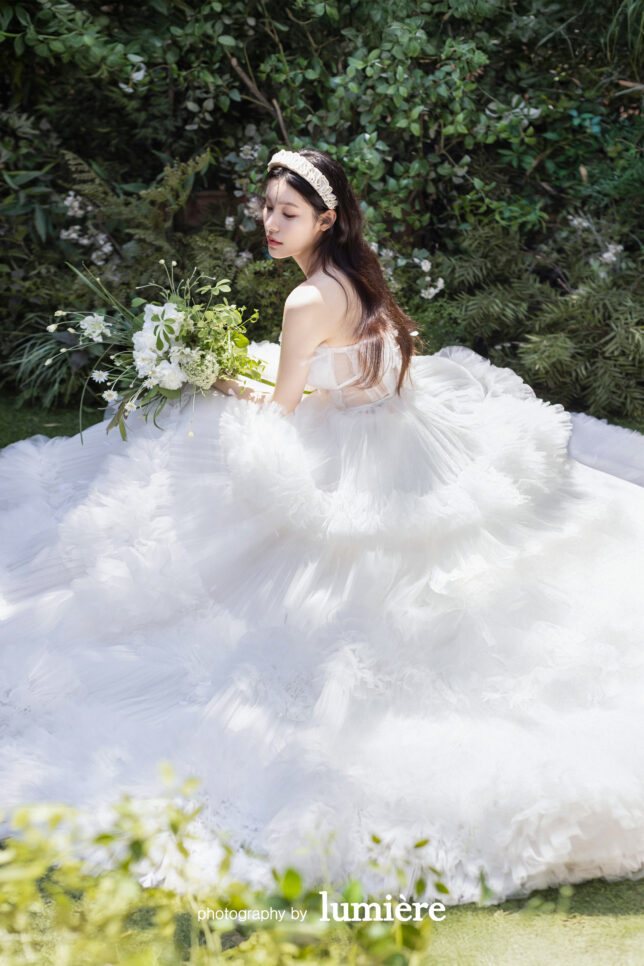 ドレスサロンのドレスを3つ着用でき、シンプルながらも人物中心のきれいな写真が撮れます。