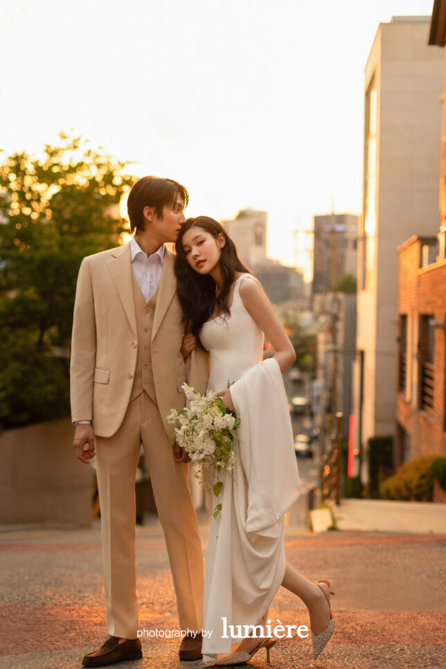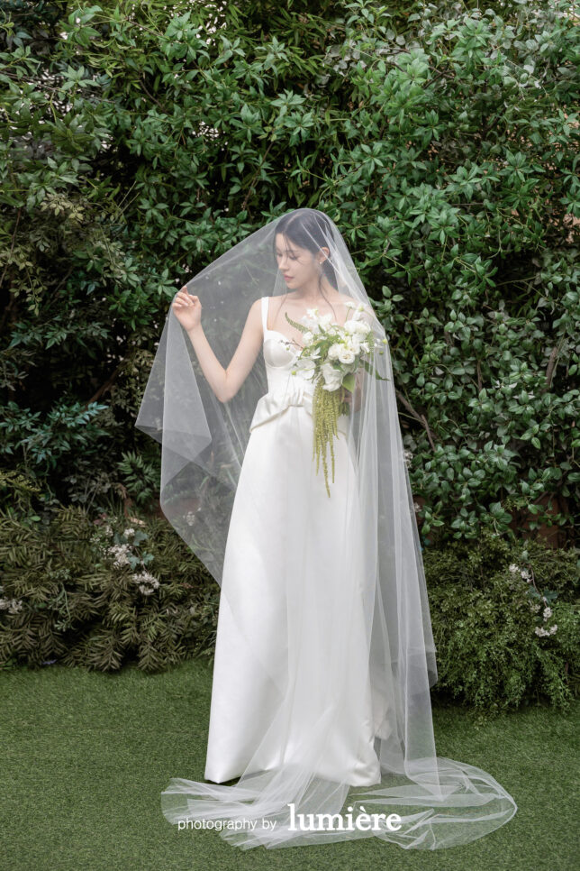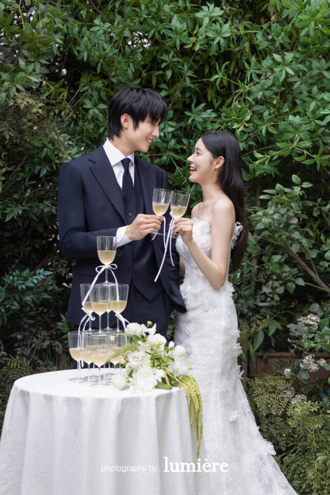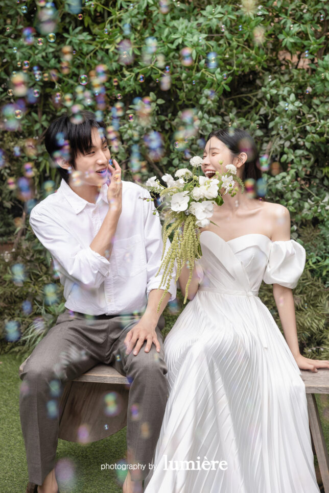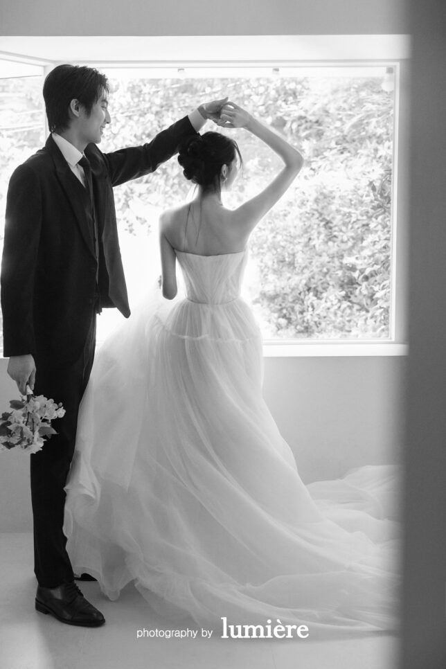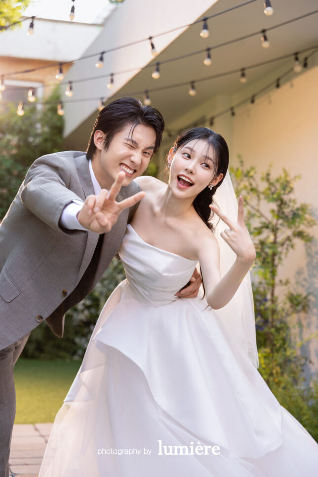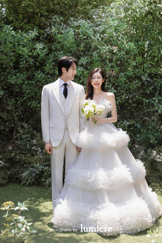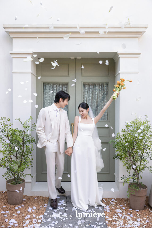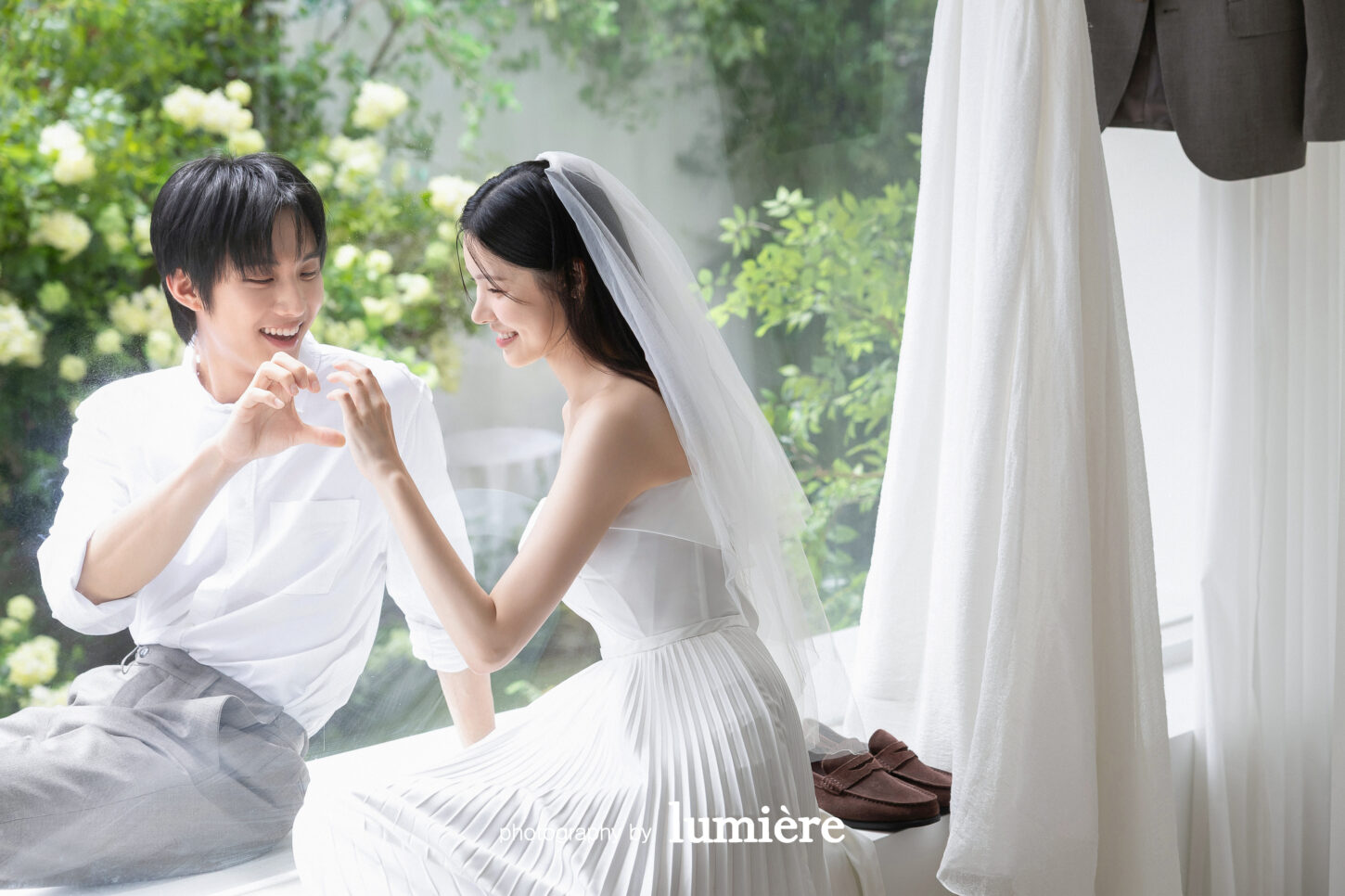 ドレスサロンのドレスを3つ着用でき、シンプルながらも人物中心のきれいな写真が撮れます。